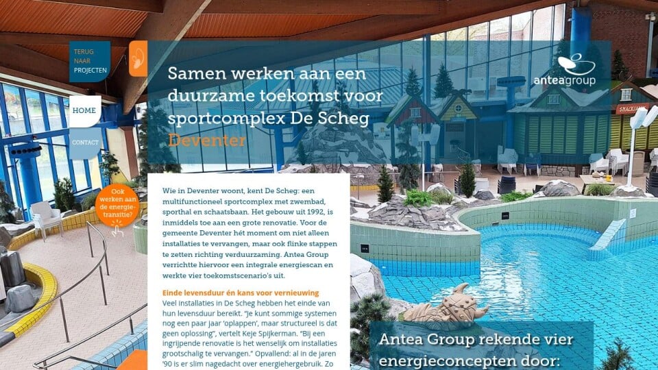 Wie in Deventer woont, kent De Scheg: een multifunctioneel sportcomplex met zwembad, sporthal en schaatsbaan. Het gebouw uit 1992, is inmiddels toe aan een grote renovatie. Voor de gemeente Deventer hét moment om niet alleen installaties te vervangen, maar ook flinke stappen te zetten richting verduurzaming. Antea Group verrichtte hiervoor een integrale energiescan en werkte vier toekomstscenario’s uit.
